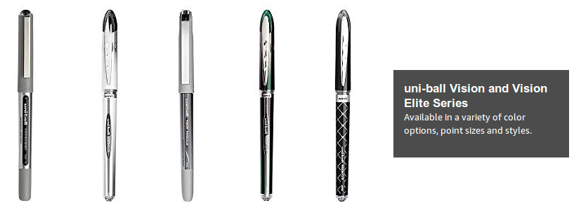 uni-ball Vision No matter which pen you select from the uni-ball Vision series, you’ll achieve an exceptionally smooth, flawless writing experience. These stick pens are available in eight ink colors, with a fine or micro point.