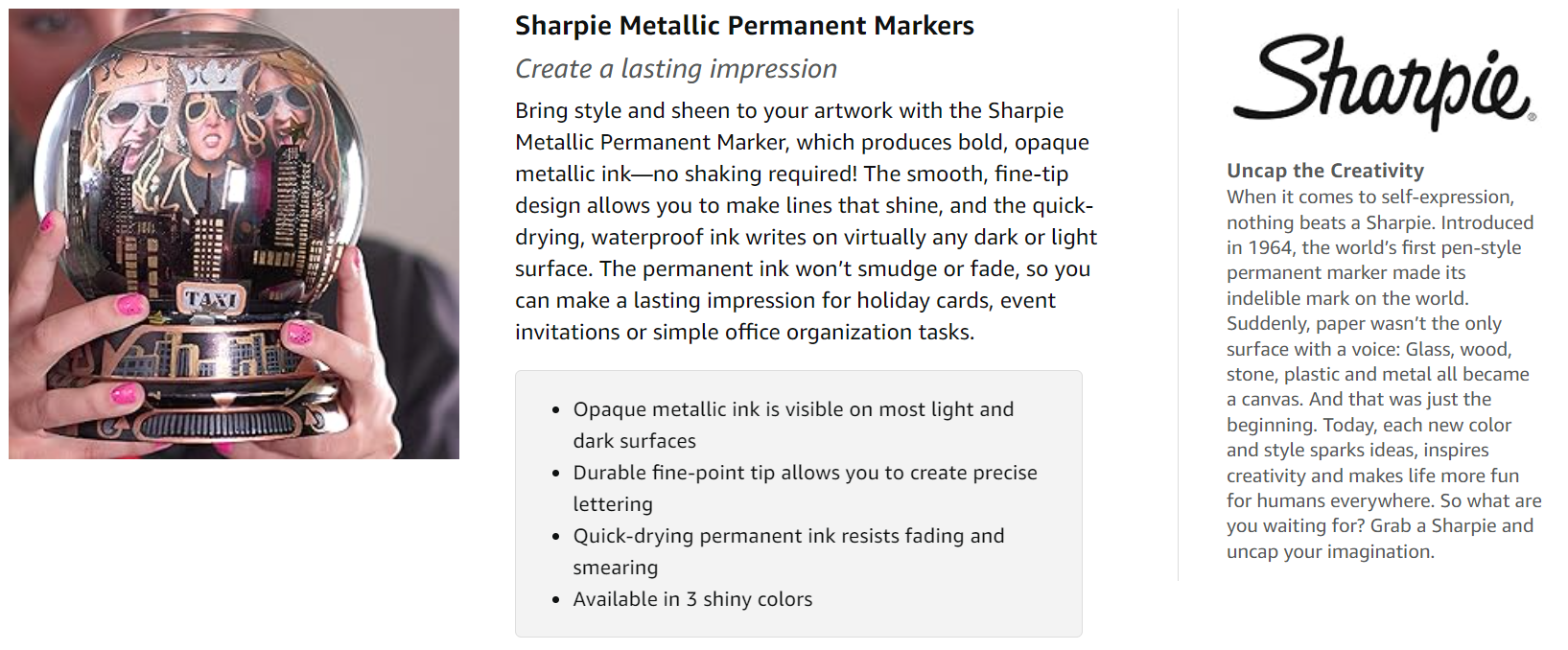 Make your work shine with the Sharpie Metallic Permanent Marker. The specially formulated, opaque, permanent ink leaves a brilliant sheen on both light and dark surfaces. Plus, the durable tip and quick-drying ink make creativity easy. Choose your favorite color—bronze, gold or silver—and get inspired.