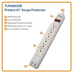 The TLP606USB offers reliable surge protection and performance enhancement for notebook computers, peripheral devices and anything with a plug. With its 6 AC outlets, 2 USB charging ports and standard 6-foot power cord, this surge protector is perfect for desktop, network and home computing applications. It fits almost anywhere in your workstation, and keyhole slots on the back of its housing allow you to easily mount it to a wall.
