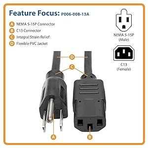 The P006-008-13A is manufactured using superior materials for reliable performance. The high-quality connectors are molded for durability and feature integral strain relief that gives the cord extra flexibility, reduces stress, and helps the cord and connectors move freely without cracking. This SJT power cord has three 16 AWG conductors and a 13-amp rating.