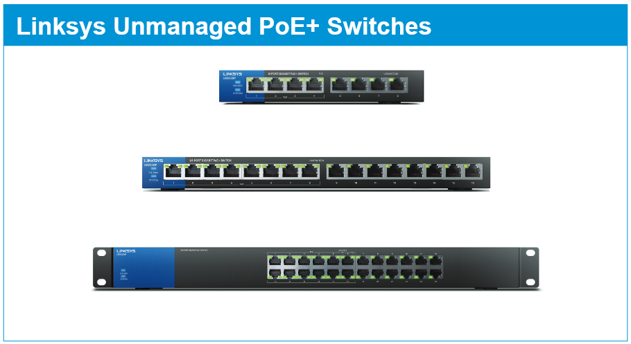 Linksys Unmanaged PoE+ SwitchesUpgrade the data paths of your local wired network to information superhighways with Gigabit switches at the desktop. Accelerate your performance and productivity when you send large files to network servers, drives, and printers at Gigabit speed. Power over Ethernet Plus (PoE+) capability also carries electrical power to peripheral devices without the need for additional outlets.