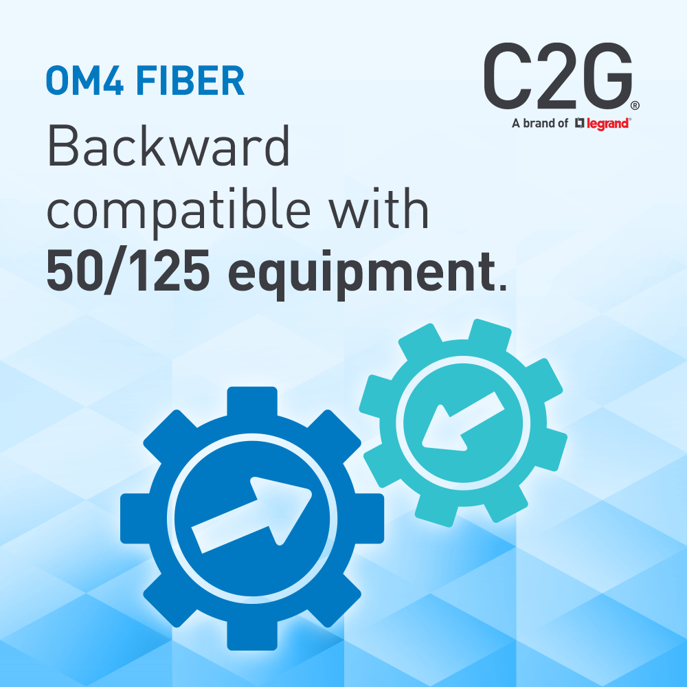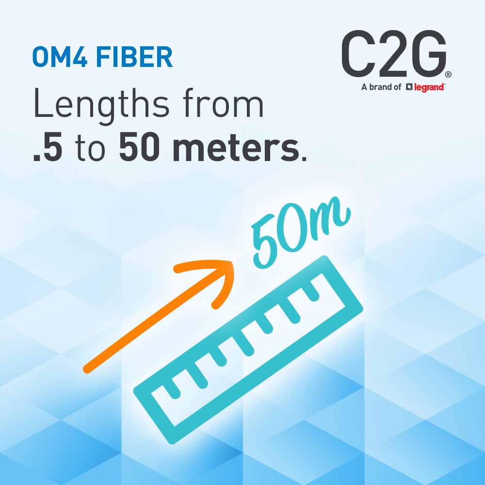 ​Backed by a liftetime warranty - C2G OM4 Duplex Multimode Fiber Optic Cables are ideal for connecting 40GBase BiDi 10GBaseSR, SFP+ and QSFP+ transceivers for 40 and 10 Gigabit network connections. C2G's OM4 fiber offering provides backward compatibility with existing 50/125 equipment and the performance headroom required to support LED and VCSEL laser light sources, and 40 or 10 gigabit Ethernet applications in a datacenter or wiring closet.