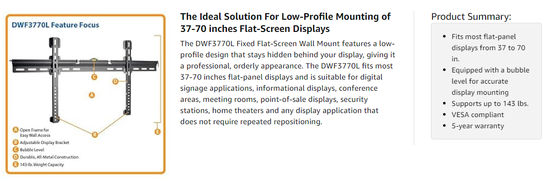 The DWF3770L’s durable, all-metal frame supports displays weighing up to 143 pounds A powder-coat finish resists scratches.