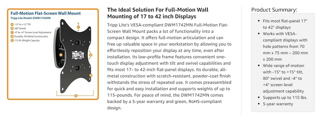 The DWT1327S’s durable, all-metal frame supports displays weighing up to 88-pounds and withstands the stress of repeated adjustments and use in common areas. Its scratch-resistant powder-coat finish tolerates frequent handling.