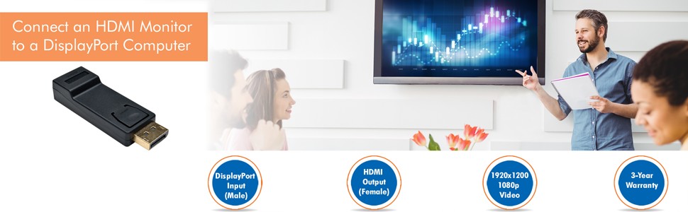 This adapter allows you to connect an HDMI monitor to a desktop or laptop computer with DisplayPort video output. Simply plug the adapter into your DisplayPort computer and connect your HDMI cable between the adapter and your monitor.