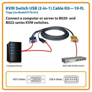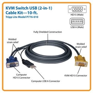 Quickly and easily connect a console to your Tripp Lite B020- or B022-Series KVM Switches. This Tripp Lite cable kit allows you to directly connect a console (keyboard, monitor and mouse) to Tripp Lite B020- and B022-Series rackmount and desktop KVMs. The P776-010 comes with VGA video and a USB-A keyboard/mouse connector. Unlike cut-price cables and adapters, the P776-010 is manufactured to exact specifications, using superior materials, for a difference you can clearly see.