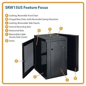 The SRW15US’s vented top and bottom panels help remove warm air from the enclosure cabinet, draw in cool air by convection and also support installation of case fans like Tripp Lite’s SRFANWM Roof Fan Kit (sold separately). The top and bottom panels contain cable ports with removable covers for cable routing through the movable portion of the enclosure cabinet or the fixed wall bracket. Both door and side panels are perforated to promote efficient airflow.