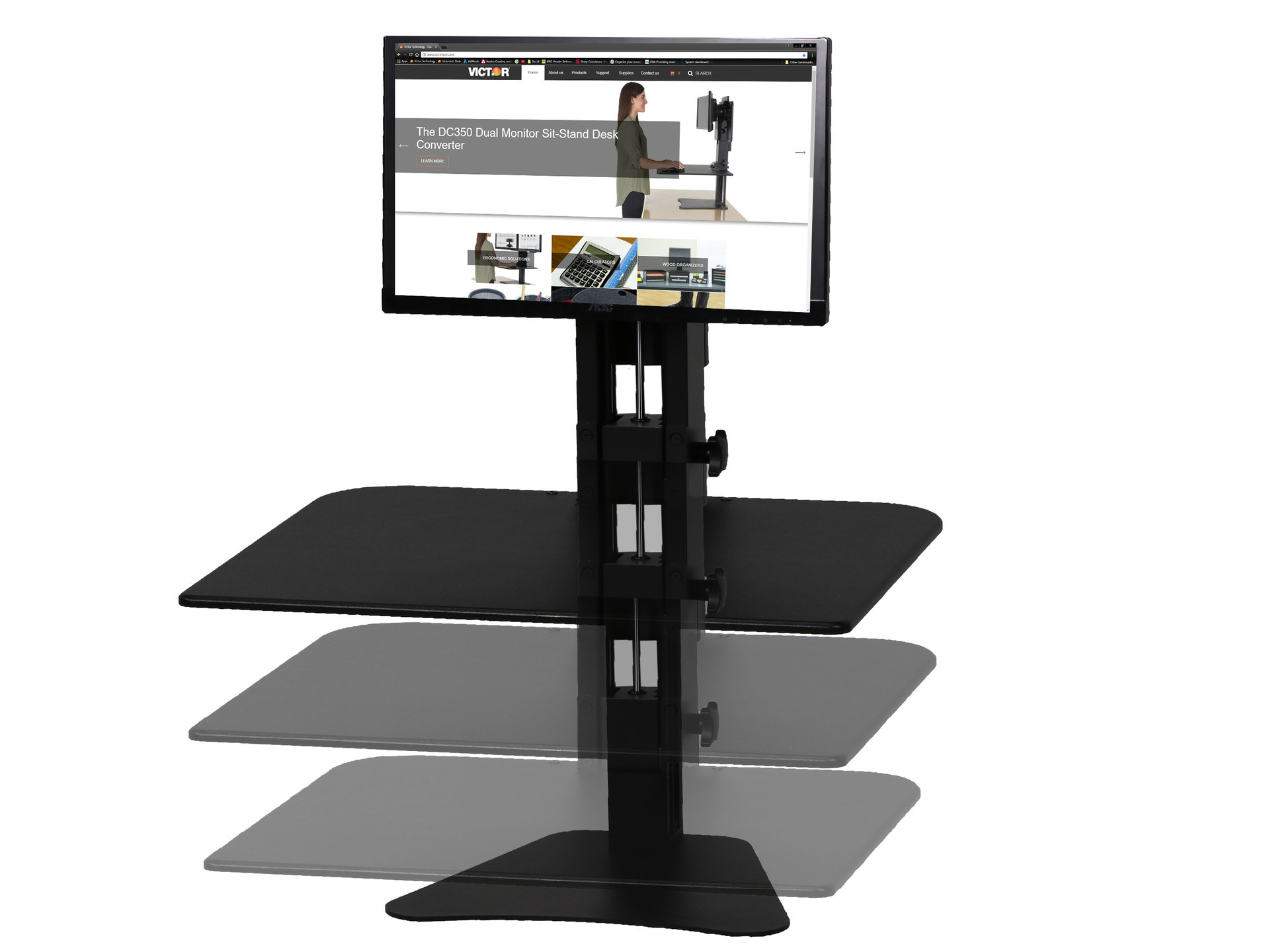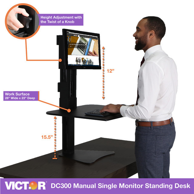 This in turn reduces or eliminates the pain users experience from being hunched over their desks and the negative long-term effects of sitting for long hours. The DC300 transforms any sit down desk into a sit OR stand-up desk. The 28” wide by 23” deep surface is raised up to 15.5” for ergonomic placement of laptop computer, keyboard, mouse, or papers while standing.