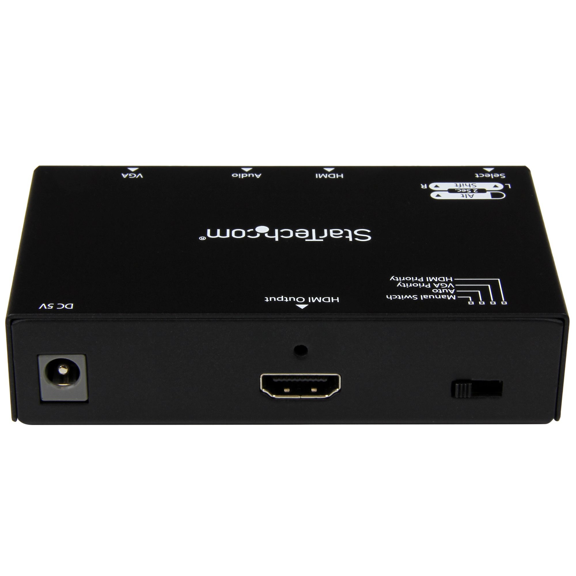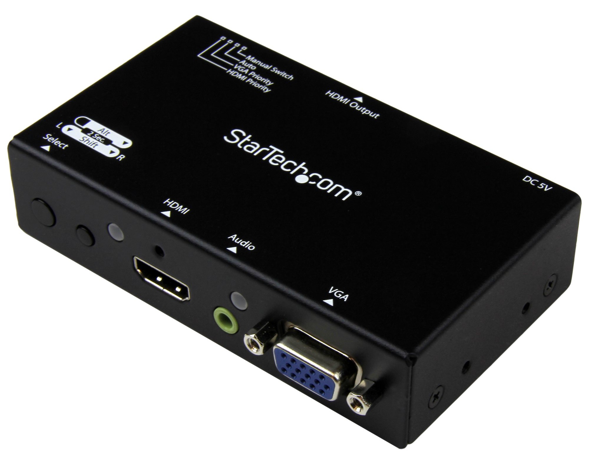 The VS221VGA2HD HDMI & VGA Auto Switch lets you connect an HDMI and a VGA audio/video source to the same HDMI display or projector, and automatically or manually switch between which video source is displayed. The multi-input A/V switch supports video resolution up to 1920x1200 (1080p) and includes mounting hardware for a tidy professional installation.