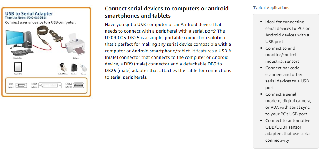 The U209-005-DB25 works with Windows 2000, XP, Server 2003, Vista, 7, Server 2008, 8, 8.1, and Server 2012; Mac OS X 10.6 - 10.9; and Linux Redhat 7.3, 8.0 and 9.0 operating systems. The U209-005-DB25 is also compatible with Android smartphones and tablets with USB Host Mode (OTG) support and Android OS version 3.2 and above. Note: Android devices require a USB Host Mode (OTG) cable (such as Tripp Lite's U052-06N) to connect the U209-005-DB25 to the device.