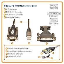 The U209-005-DB25 is manufactured using top-quality materials. The cable is double-shielded with tinned copper braid and aluminum Mylar foil shield to eliminate cross-talk and reduce EMI/RFI interference.