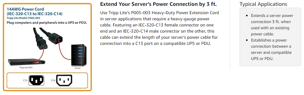 Combining heavy-gauge construction with a high amp rating, the P005-003 is designed for demanding server applications. This SJT cable has three 14 AWG conductors and is rated 15 amps, 100-250V.