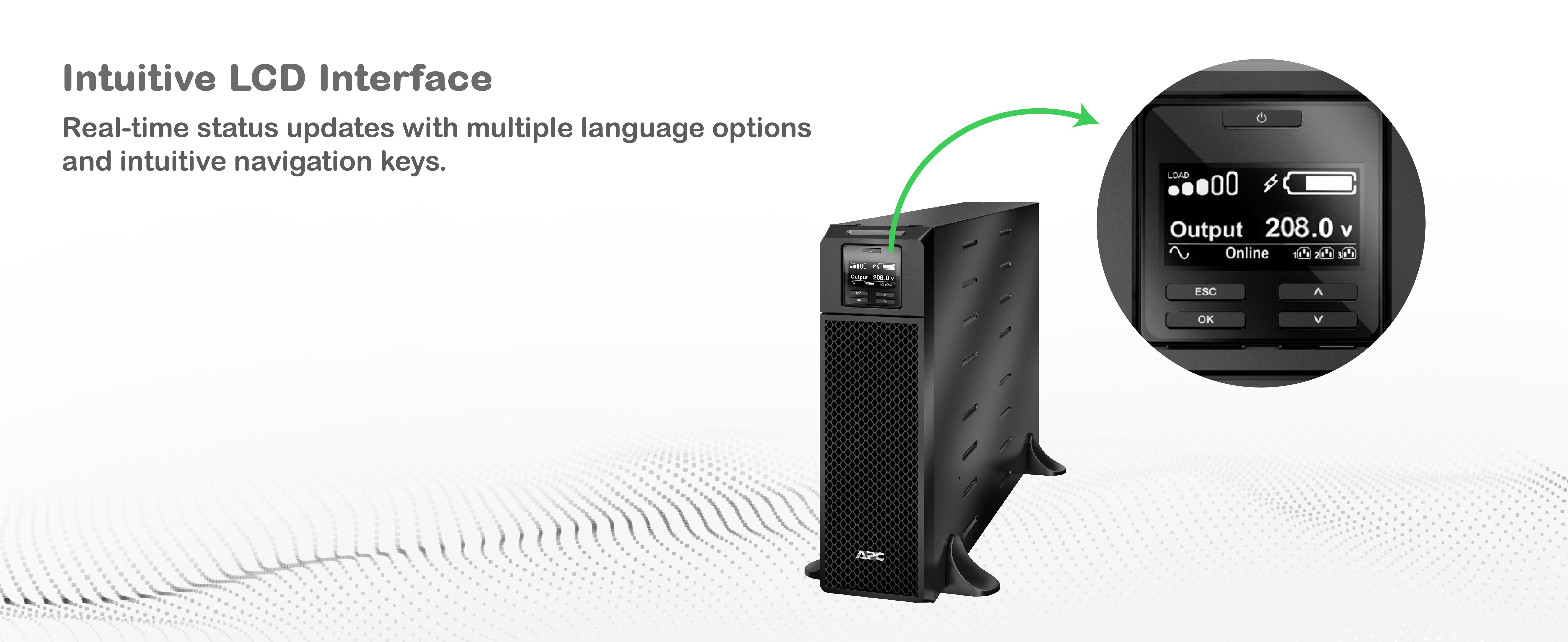 Graphical LCD display Quick, easy-to-read, intuitive LCD provides information about the utility and UPS conditions. |