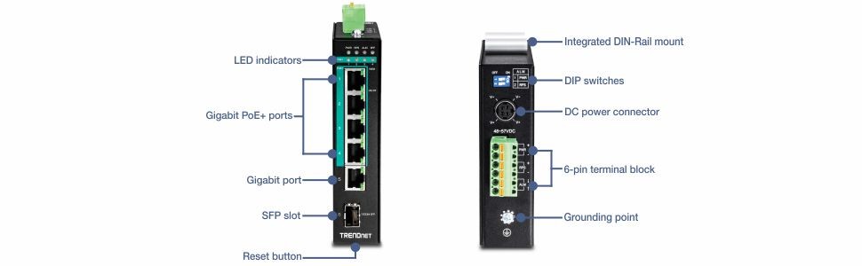 5 x Gigabit Ethernet ports (port 1-4 PoE / PoE+) and 1 x SFP slot