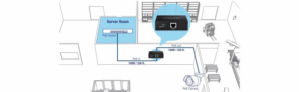 PoE PoweredExtends a single PoE/PoE+ network connection up to 100m (328 ft.) for a remote PoE or PoE+ device installation. |