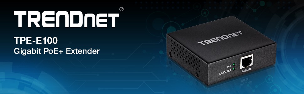 TRENDnet's Gigabit PoE+ extender, model TPE-E100, takes a single PoE+ connection and extends it an additional 100m (328 ft.) for remote PoE/PoE+ device installation. The PoE Extender auto-detects a PoE (15.4W) or PoE+ (30W) connection and extends it for a total distance of up to 200m (656 ft.) from the PoE+ power source equipment. The TPE-E100 features a convenient wall mountable design for installation flexibility. Daisy-chain up to 3 units for a total PoE+ network extension of 400m (1312 ft.).