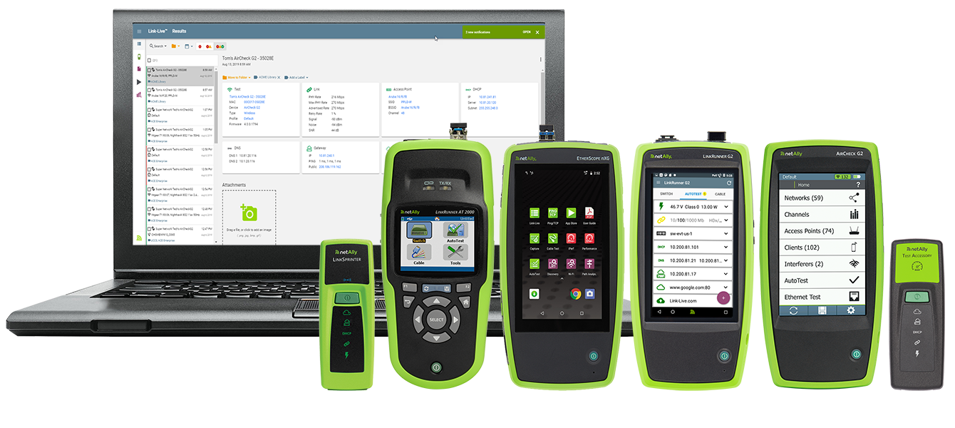 Link-Live Cloud Service provides IT Managers and Engineers a centralized cloud-based platform for collecting, managing, and analyzing test results and site data uploaded from NetAlly network testing tools. This provides organizations with the ability to easily provide proof-of-performance and better manage jobs and staff efficiency. It speeds network documentation, sharing of data and reduces duplication of effort through improved visibility and collaboration between field technician and remote engineers. An API is available to retrieve and integrate data in Link-Live to corporate systems, such as a trouble-ticket system or network management system.