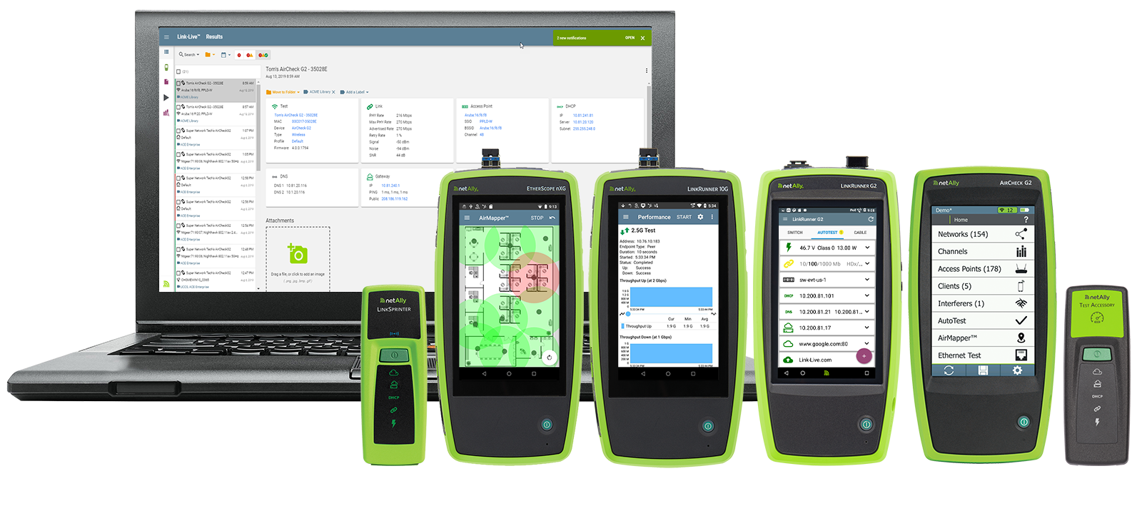 Serving as a centralized test results, analysis, and tester management system, the free Link-Live™ Cloud Service transforms team workflows with the ability to quickly and easily log, document, and report test activity from all NetAlly hand-held network testers and analyzers. Once the instrument is connected to the Link-Live Cloud service, your test results are automatically uploaded to the dashboard for project management, analysis, collaboration, and reporting.