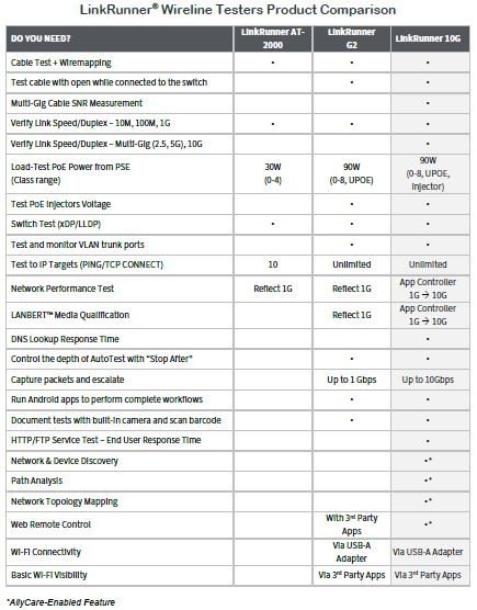 NetAlly LinkRunner AT Auto Tester quickly performs six essentials tests that fully verify an Ethernet port in less than ten seconds. You can verify twisted pair Ethernet cable length and wiremap with the network cable tester as well as measure Power over Ethernet under a load with the TruePower™ Power over Ethernet (POE) tester.