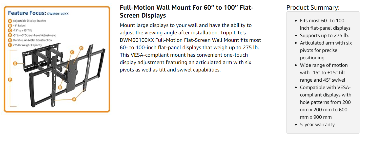The DWM60100XX has a durable, all-metal frame that supports displays weighing up to 275 lb. and withstands the stress of repeated adjustments. The frame has a powder-coated finish to resist scratches.