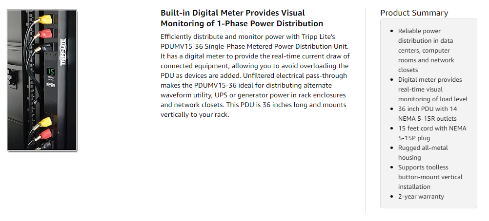 The PDUMV15-36 comes backed by a 2-year warranty. It’s manufactured in compliance with strict RoHS specifications, reflecting Tripp Lite’s commitment to environmental responsibility.