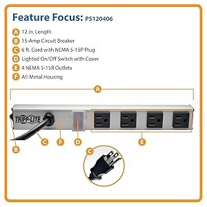 The PS120406 has four NEMA 5-15R outlets to provide 120V power to standard electronic equipment. The outlets are spaced 1.77 inches center-to-center along the 12-inch housing, allowing enough room for most AC adapters and transformers. This power strip has a 6-feet cord with a NEMA 5-15P plug.