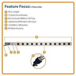 The PS361206 provides 120V power to standard electronic equipment via 12 NEMA 5-15R outlets. The outlets are spaced 2.64 inches center-to-center along the 36-inch housing, allowing enough room for most AC adapters and transformers. This power strip has a 6 ft. cord with a NEMA 5-15P plug.