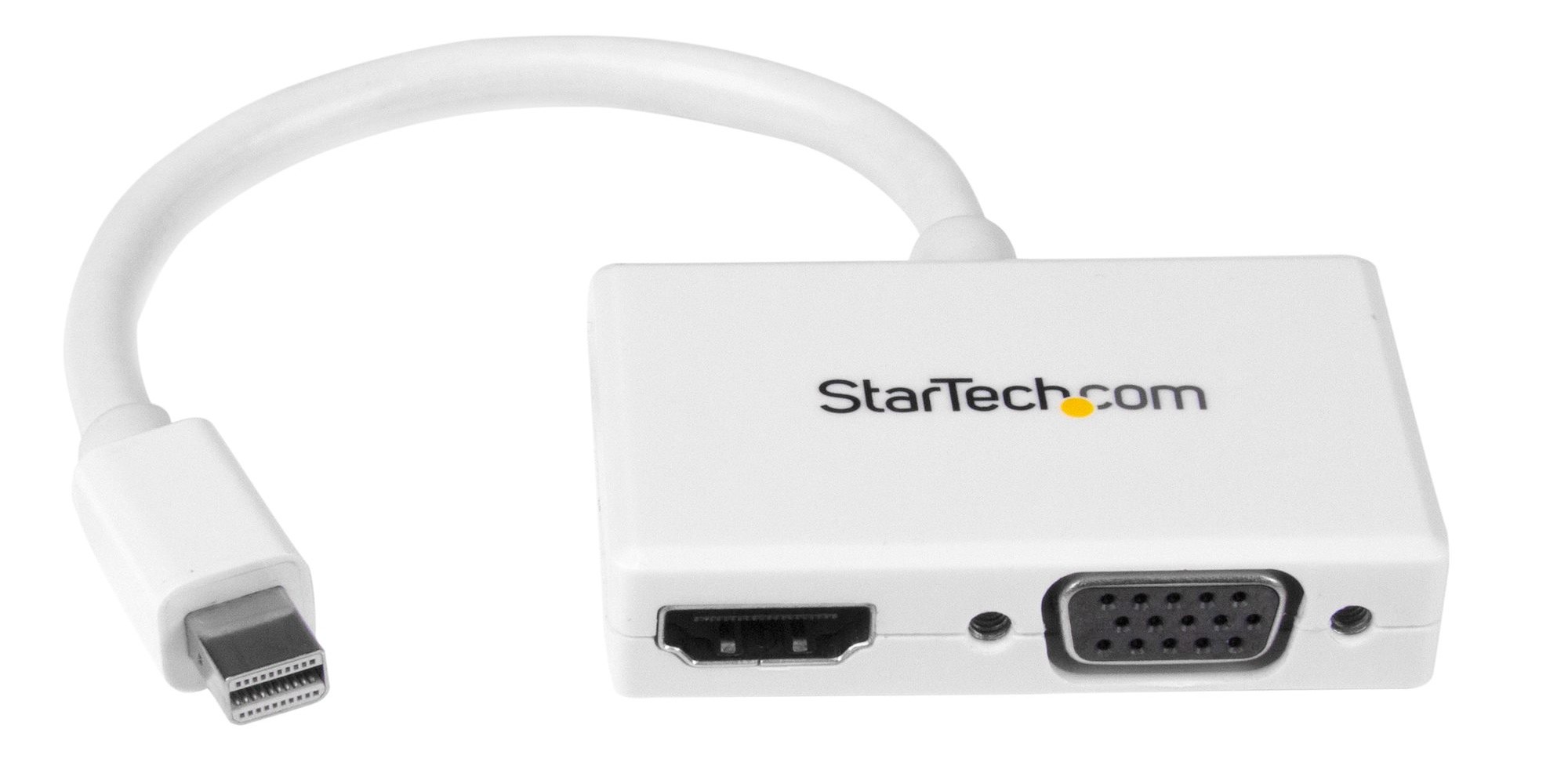The MDP2HDVGA Mini DisplayPort™ travel adapter lets you connect your mDP enabled Microsoft® Surface™ Pro, Ultrabook™ or laptop computer to any VGA or HDMI® display. The sleek adapter features an all-white design that looks great when interfaced with your MacBook Pro® or MacBook Air®.