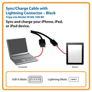 Tripp Lite’s M100-10N-BK-10 USB Sync/Charge Cables with Lightning Connector allow you to transfer data to and from your latest generation Apple® iPod, iPhone or iPad device while charging the device at the same time. These cables come in a convenient 10 pack and feature a uniquely designed reversible male Lightning connector that plugs into your device in either direction, making connections easier and faster. And, at only 10 inches, these cables reduce cable clutter and are easy to carry with you.