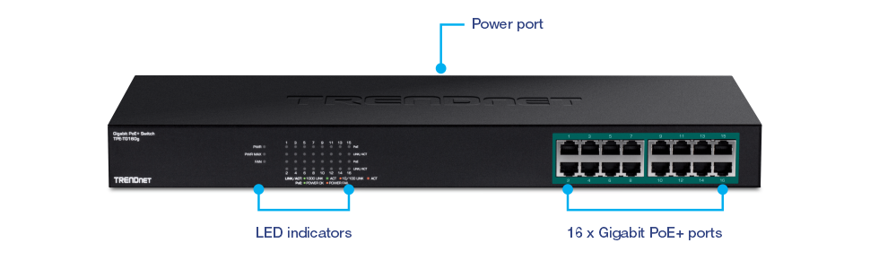 The unmanaged PoE+ switch features a 246W total PoE power budget, and supplies 16 Power over Ethernet devices with up to 30W per port.