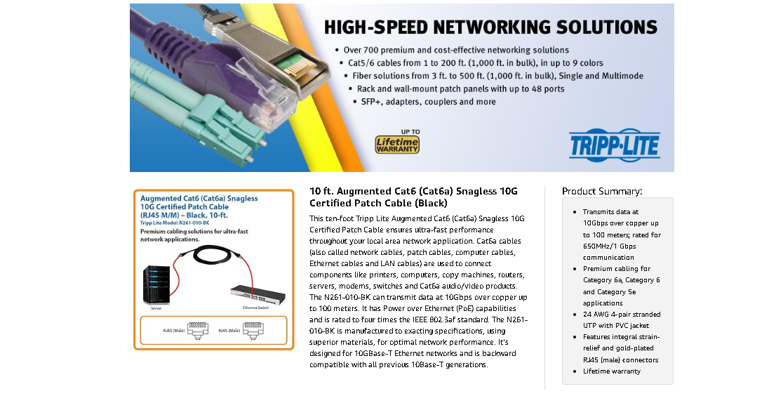 Manufactured from 24 AWG 4-pair stranded UTP, the N261-010-BK provides high-speed connections and flawless signal delivery. Featuring a PVC jacket, this Cat6a cable is constructed of top-quality materials for long life and durability. Its RJ45 (male) connectors are gold-plated to ensure an accurate signal transfer. For a secure connection, the cable has molded integral strain-relief and a snagless design that protects the locking tabs on the RJ45 connectors from being damaged or snapped off during installation. The N261-010-BK meets the most current industry standards, including IEEE 802.3af, IEEE 802.3ab, IEEE 802.5, ANSI/EIA/TIA 568, ISO/IEC 11801, DTE and ETL. The N261-010-BK is fully tested on Fluke test equipment to guarantee that it meets or exceeds all Category 6 requirements. The test results are available upon request