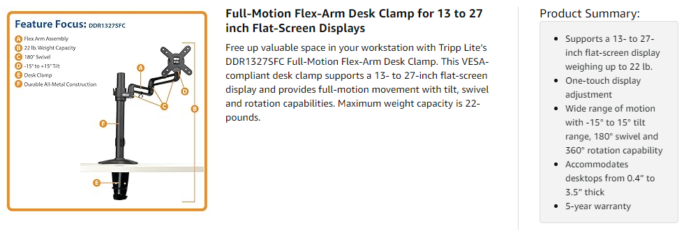 The DDR1327SFC has a durable, all-metal frame to withstand the stress of frequent adjustments. The frame has a powder-coated finish to resist scratches. The clamp accommodates desktops from 0.4 to 3.5 inches thick.