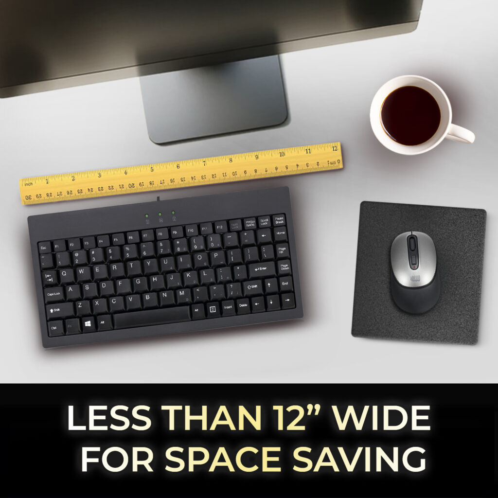 This keyboard is only 11.75″ wide and is designed with a Windows Key layout that includes an embedded numeric keypad. This keyboard is a great space saver for your home or office. This keyboard is ideal for use in POS stations, sales, or information kiosks, warehouses, manufacturing environments or anywhere space is limited.
