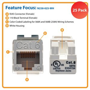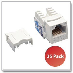 This convenient 25-pack of Tripp Lite’s Cat6/Cat5e 110-Style Punch-Down Keystone Jacks provides flexibility in Cat6 and Cat5e installations. The jacks feature a uniquely patterned printed circuit board that delivers Cat6 250 MHz performance. They also have dual color-coded labeling for both 568A and 568B (258A) wiring schemes. Jacks have a white housing and mount in conventional face plates, outlet boxes and panels.
