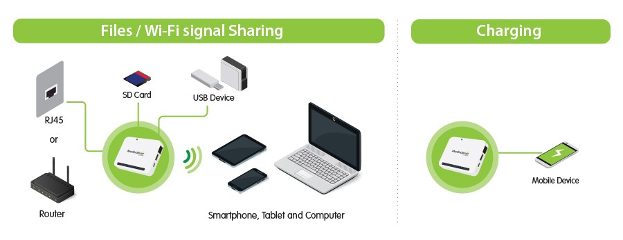 IOGEAR's MediaShair 2 Hub is your ultimate traveling companion! Besides keeping you entertained on the road with access to your favorite movies, music, photos and files, the MediaShair 2 Hub turns your hotel's wired Internet to WiFi making it a great travel router. If your hotel has WiFi but charges per IP connection, use the MediaShair 2 Hub as a WiFi Hotspot to repeat wireless Internet to all your devices for a single charge. If your smartphone is running low on battery while you are away from a power source, plug in your phone's charging cable and use the MediaShair 2 Hub to give you a quick boost.
