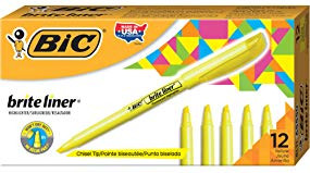 Whether organizing your notes or underlining passages in a textbook, BIC Brite Liner Highlighters make the job fun and easy. Highly-visible, fluorescent ink helps you color-code and emphasize information, and the versatile, firm chisel tip allows you to seamlessly switch between broad highlighting and precise underlining. BIC Brite Liner Highlighters can be left uncapped for up to eight hours without drying out, and the convenient pen-shaped design is comfortable easy to grip.