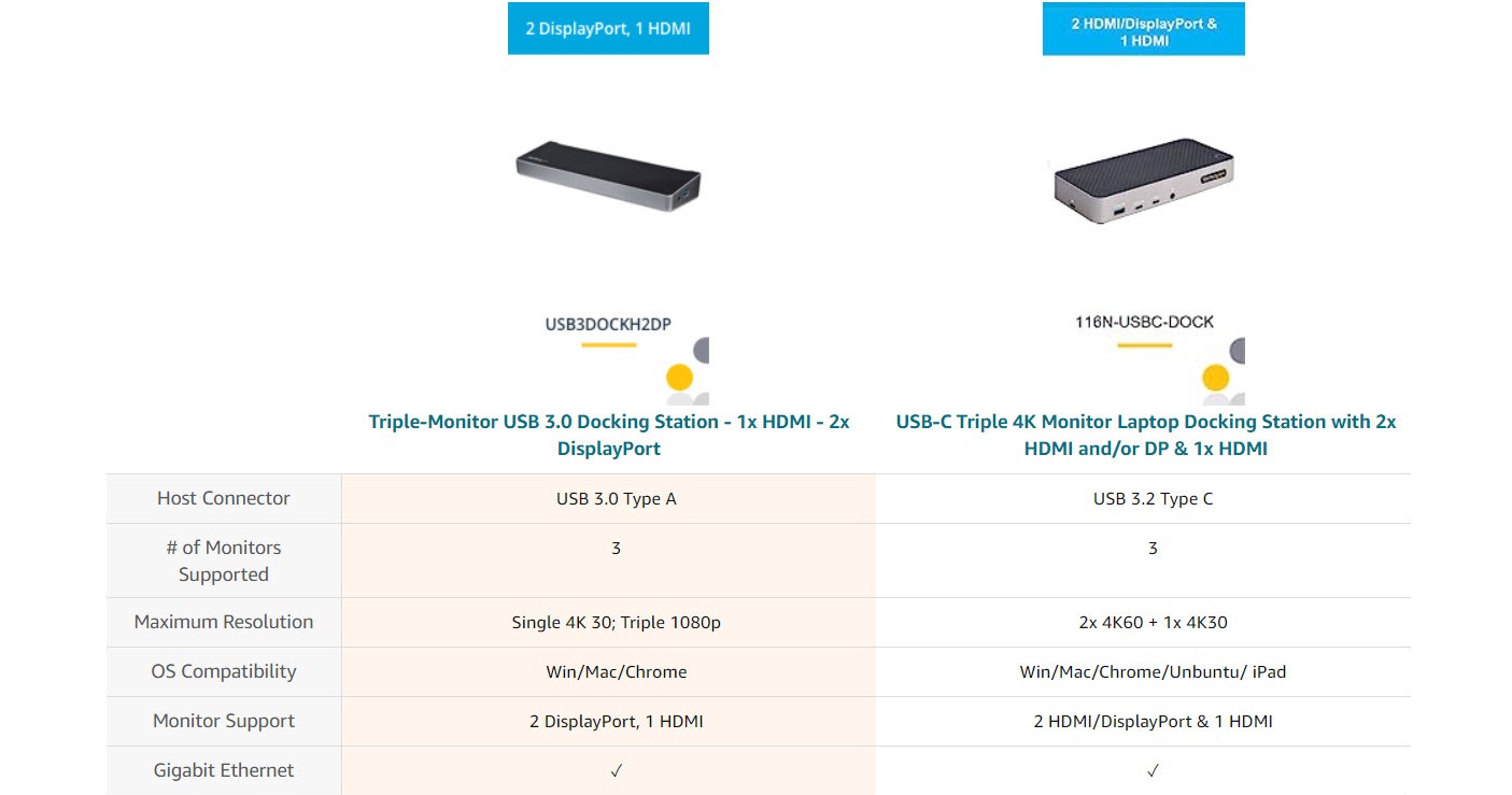The USB 3.0 docking station adds triple-monitor support to your workstation, with resolution support up to 4K (3840 x 2160p) on one display and 2048x1152 on the other two.
