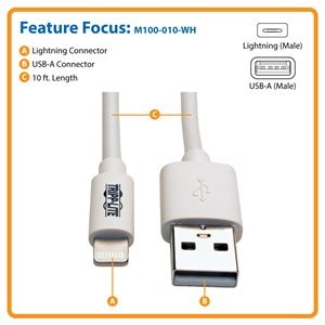 The 10-foot M100-010-WH is MFi-certified for use with iPhone, iPad and iPod devices. It’s compatible with iPhone (5, 5c, 5s, 6, 6 Plus), iPad (4