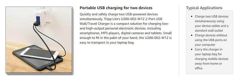The U280-002-W12 features two 5-volt USB-A charging ports that deliver a total of 3.4 amps of power. Use the 1.0A port for charging smartphones and MP3 players; use the 2.4A port for charging tablets and similar devices. The U280-002-W12 detects the connected device and automatically adjusts the USB signal and power output to provide the fastest charging speed. The charger protects against overloads, short circuits, overcurrent and overvoltage.