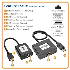 The plug-and-play B150-1A1-HDMI requires no external power, software or drivers, no matter which major operating system you use. Just connect the transmitter’s built-in DisplayPort cable to the source device and a Cat5e/6 cable between the transmitter’s RJ45 output jack and the receiver. Connect the receiver’s built-in HDMI cable to the display. Both units are powered via the included USB Micro-B cables, which connect to USB ports on the source and display devices or USB wall chargers. LEDs light up to indicate when the units are receiving power and sharing a signal. Use the receiver’s equalization control to adjust the video image.