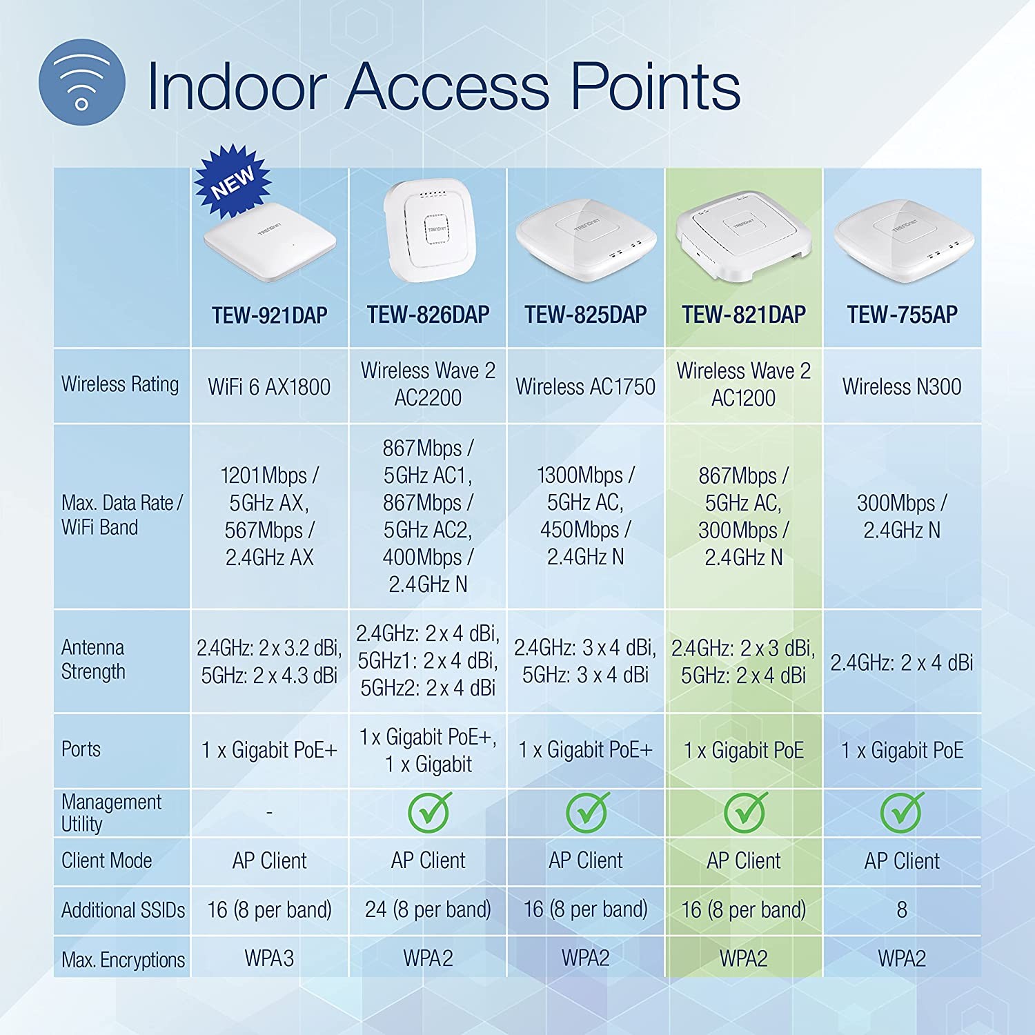 TRENDnet’s high performance AC1200 Dual Band Indoor Wireless PoE Access Point, model TEW-821DAP, supports Access Point (AP), Client Bridge, Wireless Distribution System Access Point (WDS AP), WDS Bridge, WDS Station, and Repeater modes. This wireless indoor access point generates concurrent 867Mbps WiFi AC and 300Mbps WiFi N networks. MU-MIMO technology processes multiple data streams simultaneously, increasing real-time WiFi performance when multiple devices access the network. It features advanced access control, QoS, traffic management, band steering, and captive portal support. The low-profile housing design blends into most environments and includes a convenient wall / ceiling mounting plate with cable guard.