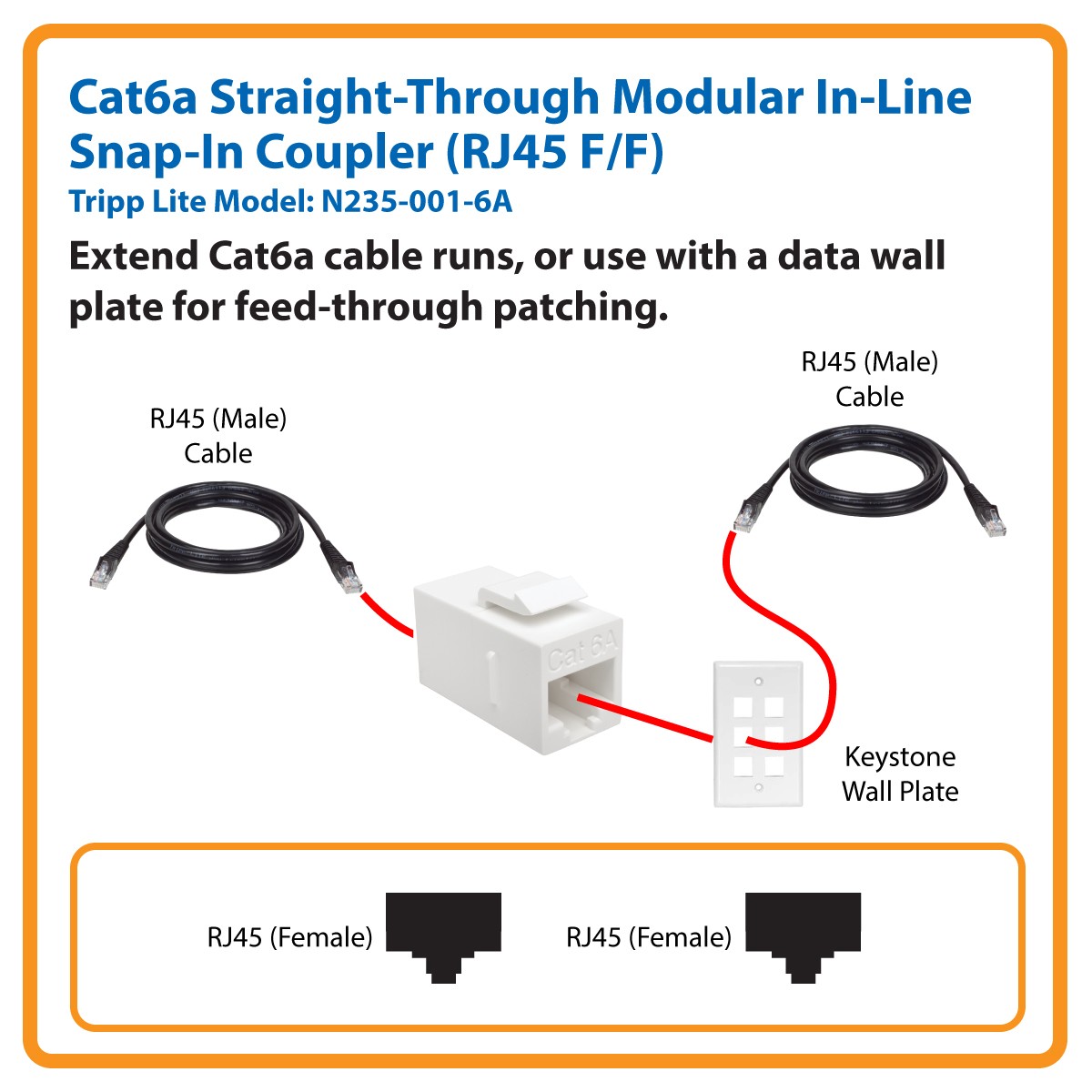 The N235-001-6A can be used as a stand-alone coupler to extend the length of your Cat6a cable run. It has a keystone design that gives you the option of snapping it into a standard data wall plate, such as Tripp Lite’s N042-001-WH, for feed-through patching installations.