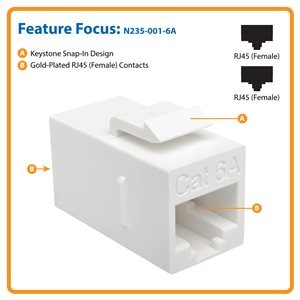 Made with high-quality materials, the N235-001-6A is UL listed and meets all requirements for EIA/TIA Category 6A compliance. The RJ45 jacks have contacts with 50-µinch gold plating for optimal network performance. A white heavy-duty plastic housing offers durability and long life.