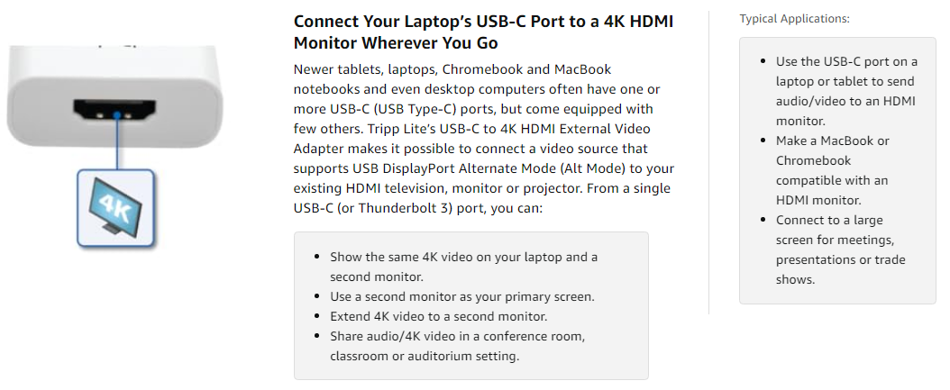 Connect your HDMI cable to the adapter and you’re ready to enjoy digital audio and ultra high-definition video. This adapter supports USB DisplayPort Alternate Mode and the following:
