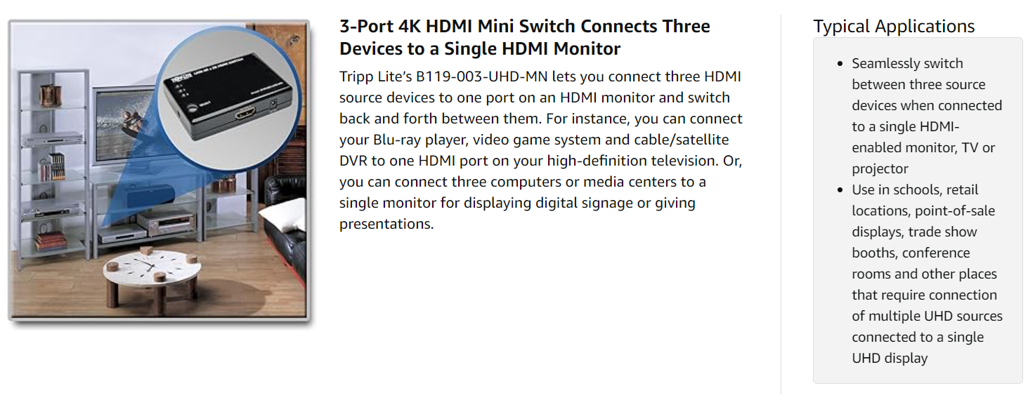 For peace of mind, the B119-003-UHD-MN comes backed by a three-year warranty. It’s manufactured in compliance with strict RoHS specifications, reflecting Tripp Lite’s commitment to environmental responsibility.