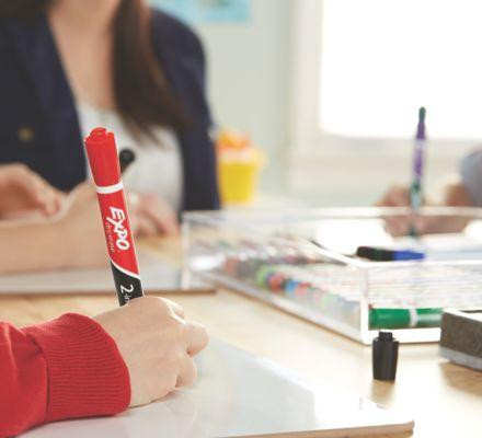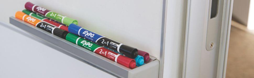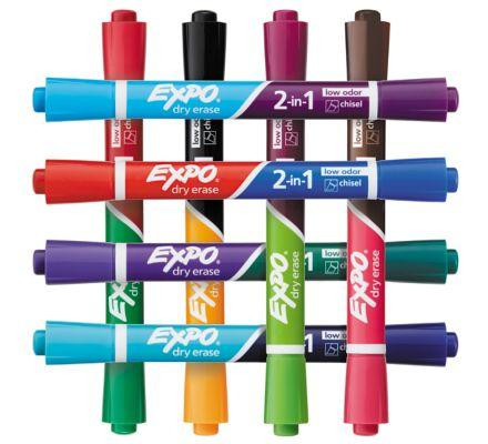 Track, schedule and present with double the color. Dual-ended Expo 2-in-1 Dry Erase Markers have a different bold shade at each end and a chisel tip that marks three line widths. That means you can create precise lettering with one color and flip to boldly add emphasis. Low odor ink that’s highly visible helps you create compelling, distraction-free visuals. From the classroom to the boardroom, Expo 2-in-1 Dry Erase Markers add excitement to every situation.