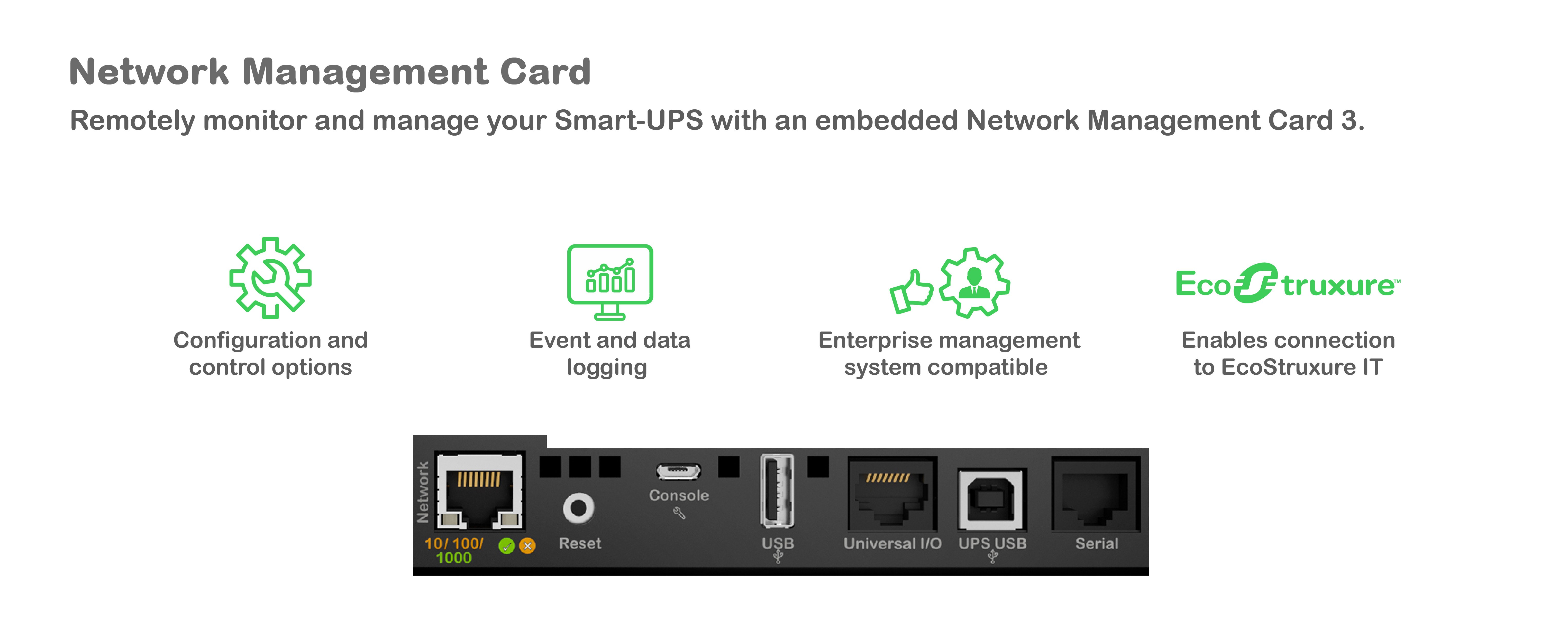 Options for monitoring and managing your UPS include EcoStruxure IT, Network Management Card, and PowerChute™ Network Shutdown Software.