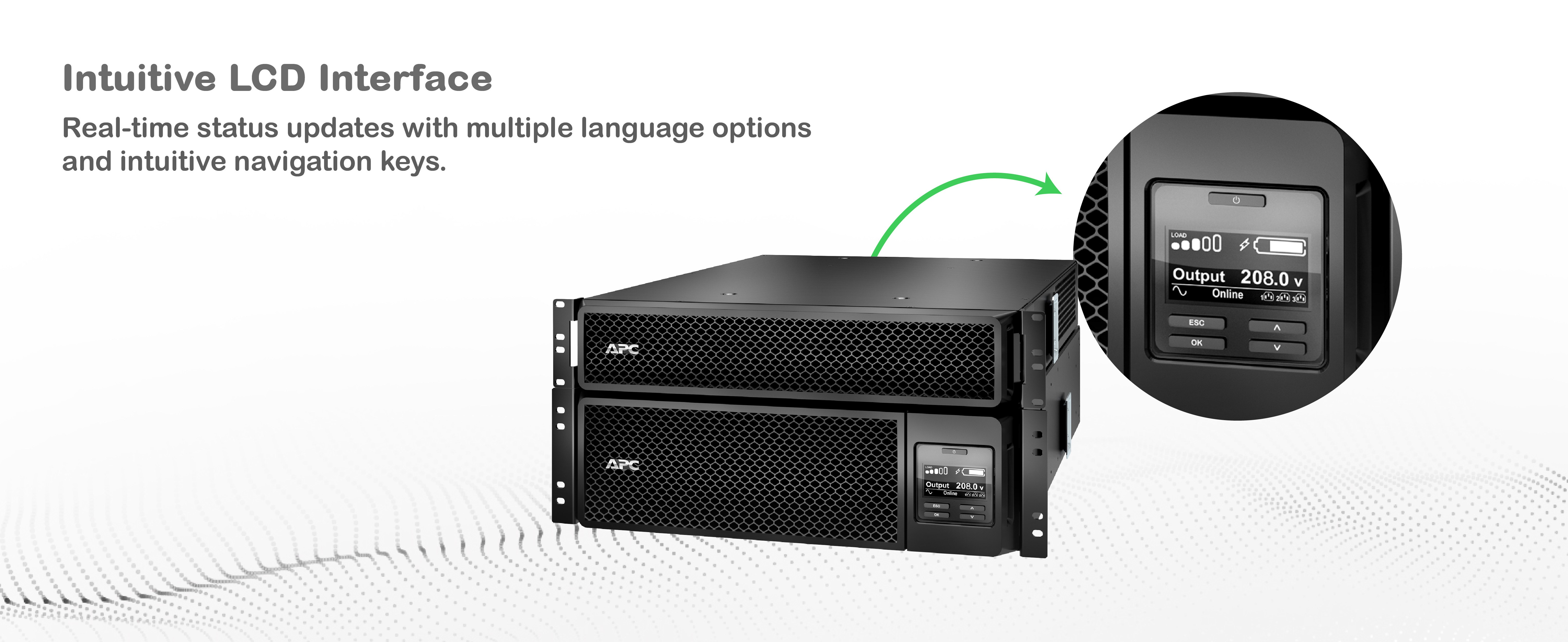 Graphical LCD display Quick, easy-to-read, intuitive LCD provides information about the utility and UPS conditions. |
