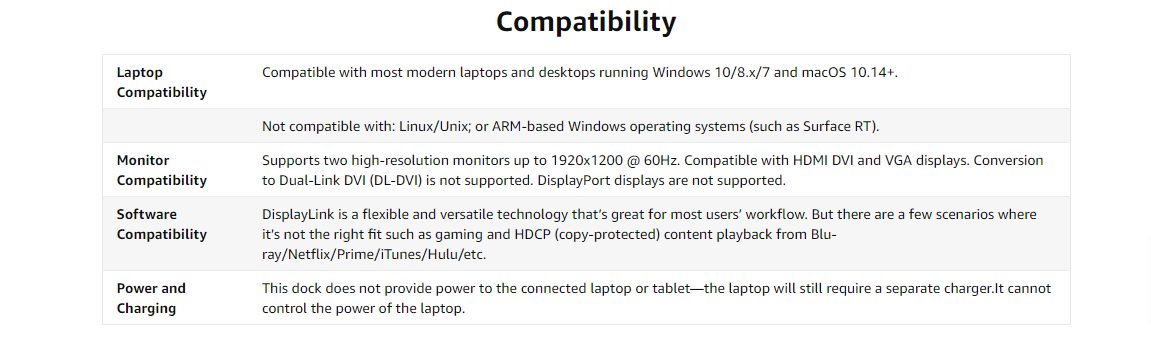 Note: This dock will not charge your laptop and will need your external charger to provide power to your system. The dock has one HDMI port and one DVI port, no DVI to VGA adapter or DVI to HDMI adapter if included (not compatible with DisplayPort displays).