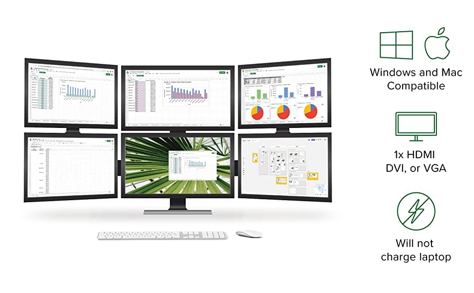 Connect multiple USB 3.0 display adapters to your computer to expand your screen space by up to six additional 2048x1152 displays (1920x1080 with analog VGA).